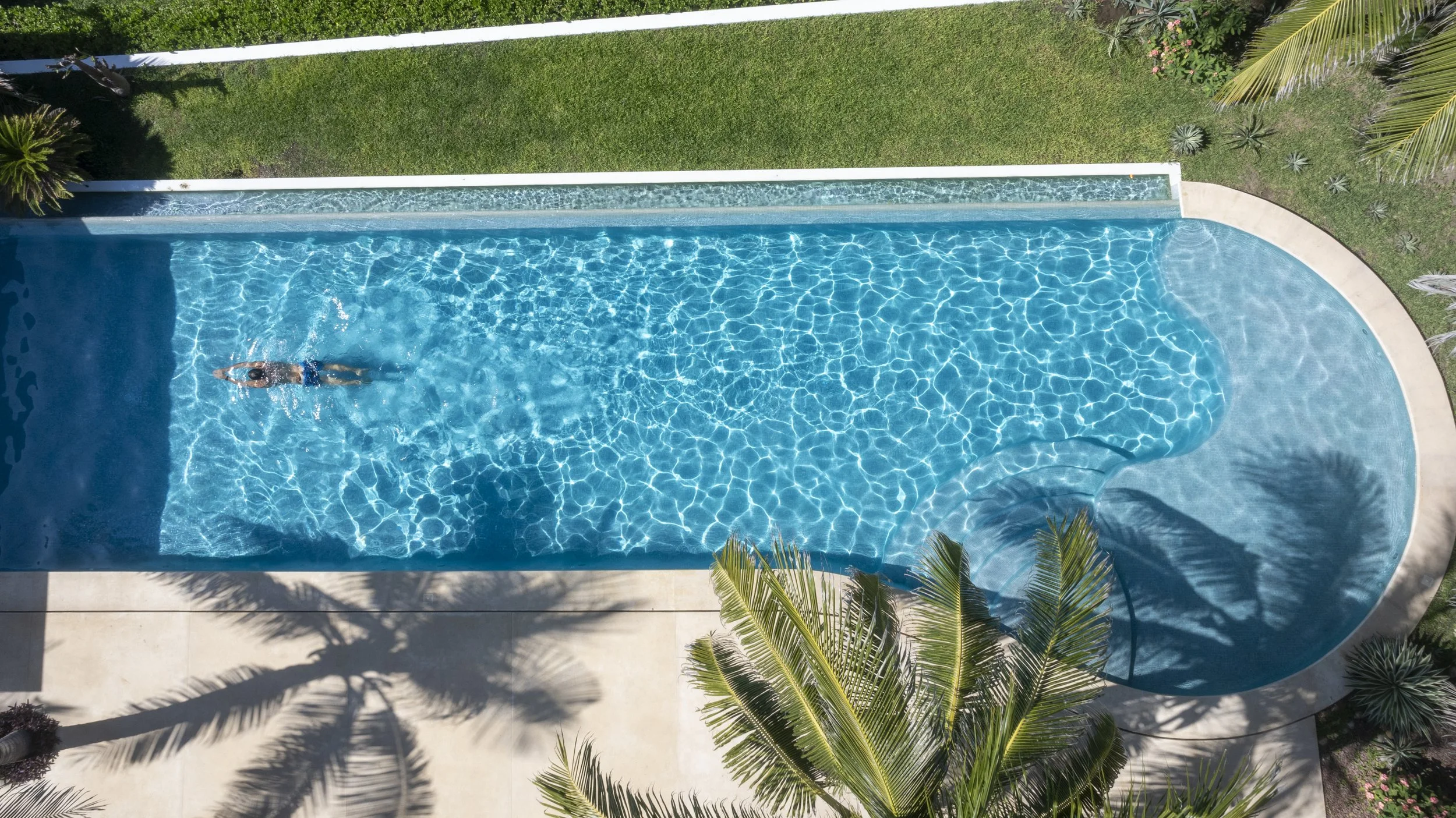 Piscina infinita de 25m x 5m con parte poco profunda para niños.